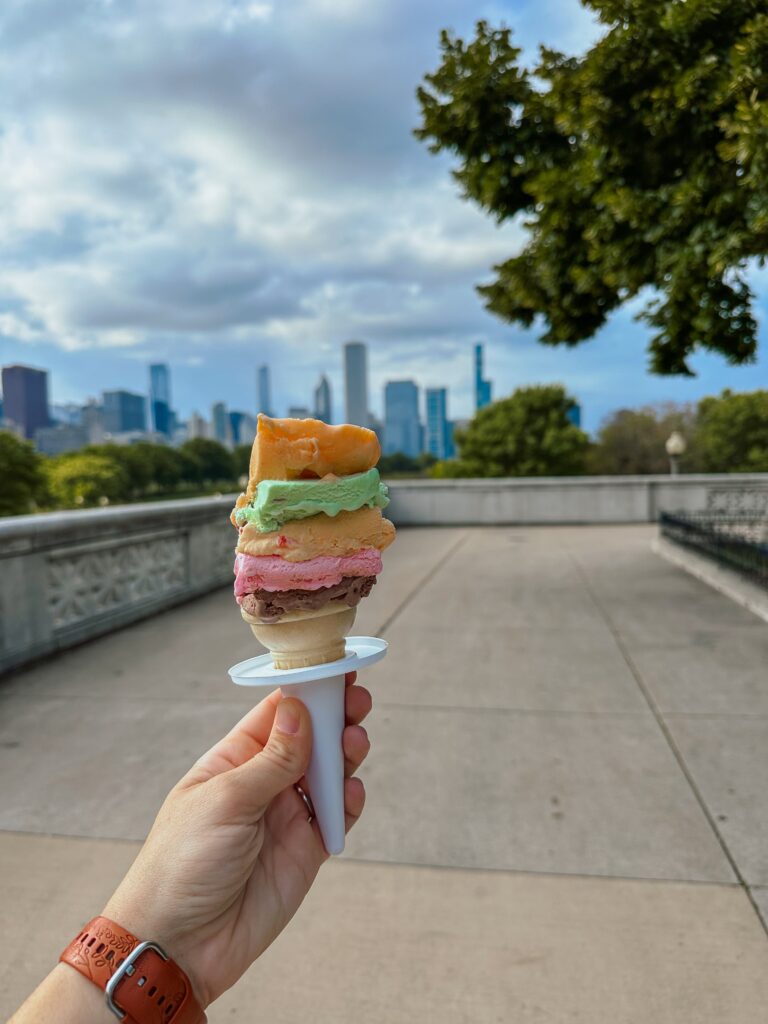 After we finished at the aquarium, we headed towards Lake Shore drive. There were some food trucks parked, and we grabbed a Chicago style hot dog and a famous rainbow cone (both were yum!). Then we walked along Lake Shore drive to take in the views on Lake Michigan and the Chicago Skyline. We stopped at Buckingham Fountain, one of Chicago’s most iconic landmarks, before catching the bus back to our hotel.