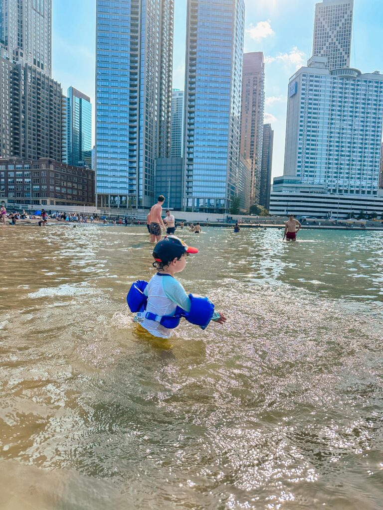In the afternoon, we grabbed our swimsuits and took the bus to Ohio Street Beach, one of the best beaches for families visiting Chicago. It offers calm water, skyline views, and lifeguards on duty.