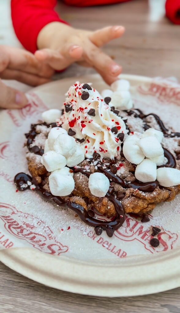 - Flavored Funnel Cakes: A park favorite with a Christmas twist; seasonal flavors include Red Velvet and Ultimate Hot Chocolate (both are so good!).