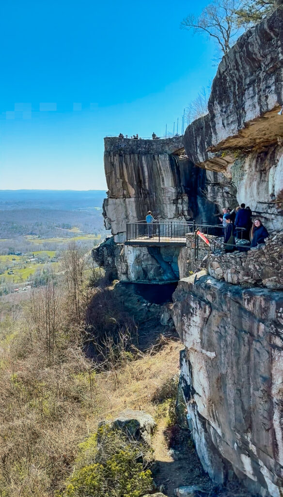 Afterward, drive up to Sunset Rock Viewpoint for panoramic views of the valley below. Even if you come mid-day, the views are still stunning. Then, head to Rock City Gardens, a whimsical mountaintop attraction filled with narrow passages, swinging bridges, and the famous “Seven States” viewpoint. It’s kind of a cross between a botanical garden and a rock garden, but it should definitely be on your list to visit. We had so much fun exploring all the fun spots here, like “fat man’s squeeze”.